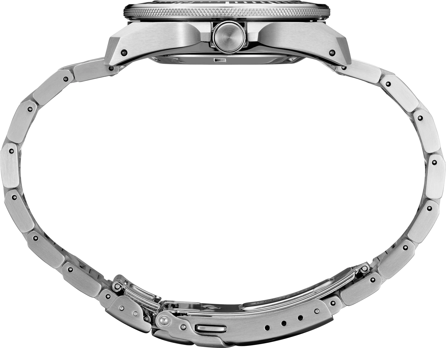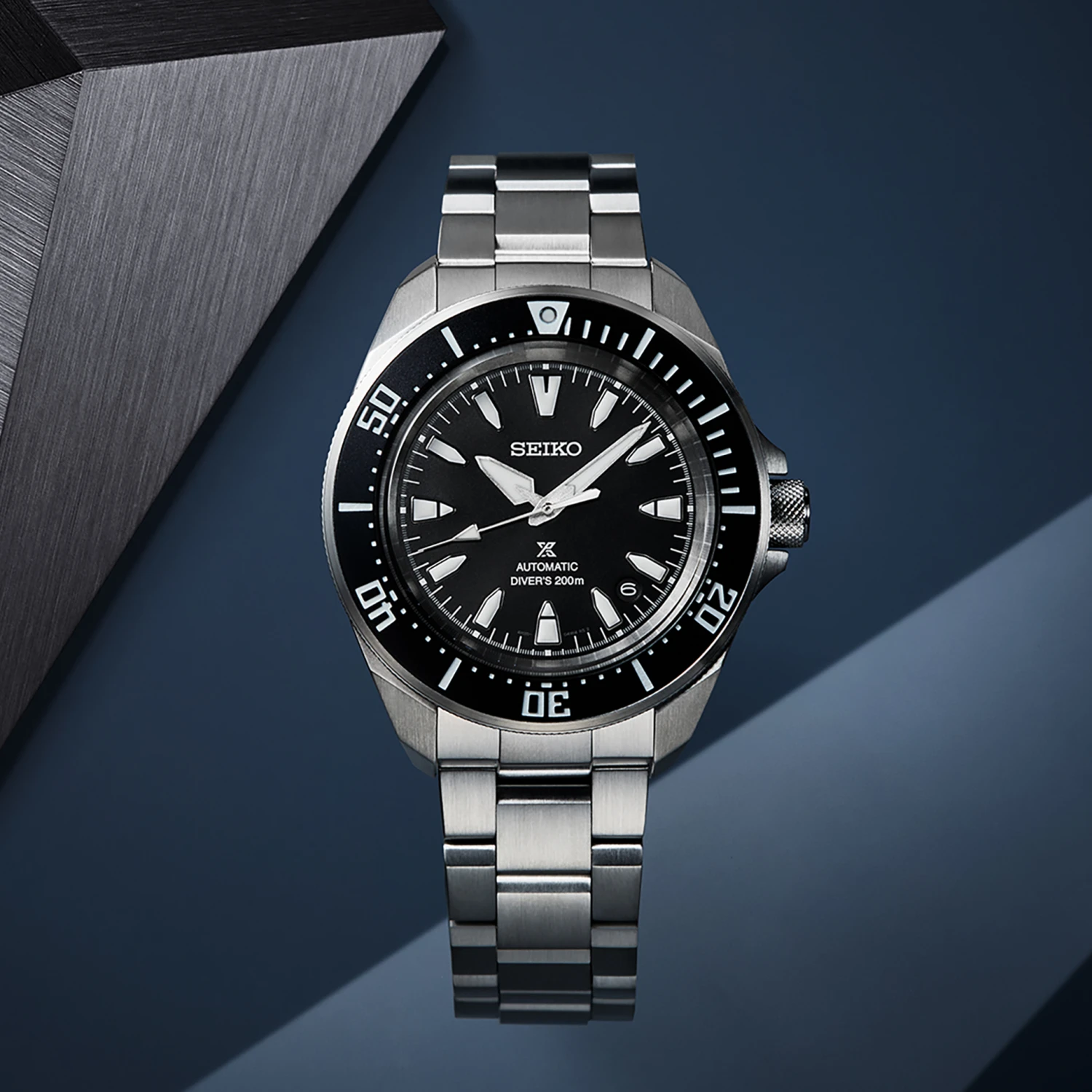 Prospex Automatic Diver. Designed for those who treat life as the ultimate adventure, the Seiko Prospex line meets every challenge with technological excellence and winning design. Inspired by Seiko’s most iconic diving styles, the case retains the straight contour of the original design with a sharpness enhanced by a sleeker more compact profile. For reliable timing in rough waters, the 23-jewel automatic movement beats at a frequency of 21,600 vibrations per hour, with a power reserve of approximately 41 hours, and can be wound manually or automatically. Framed by a black uni-directional rotating elapsed timing bezel, the black dial features a date calendar and LumiBrite hands and markers. Crafted of stainless steel, this high-intensity timepiece follows ISO standards for scuba diving and is equipped with a secure screwdown crown and caseback and a tri-fold push button release clasp with secure lock and extender. 200m Water Resistant