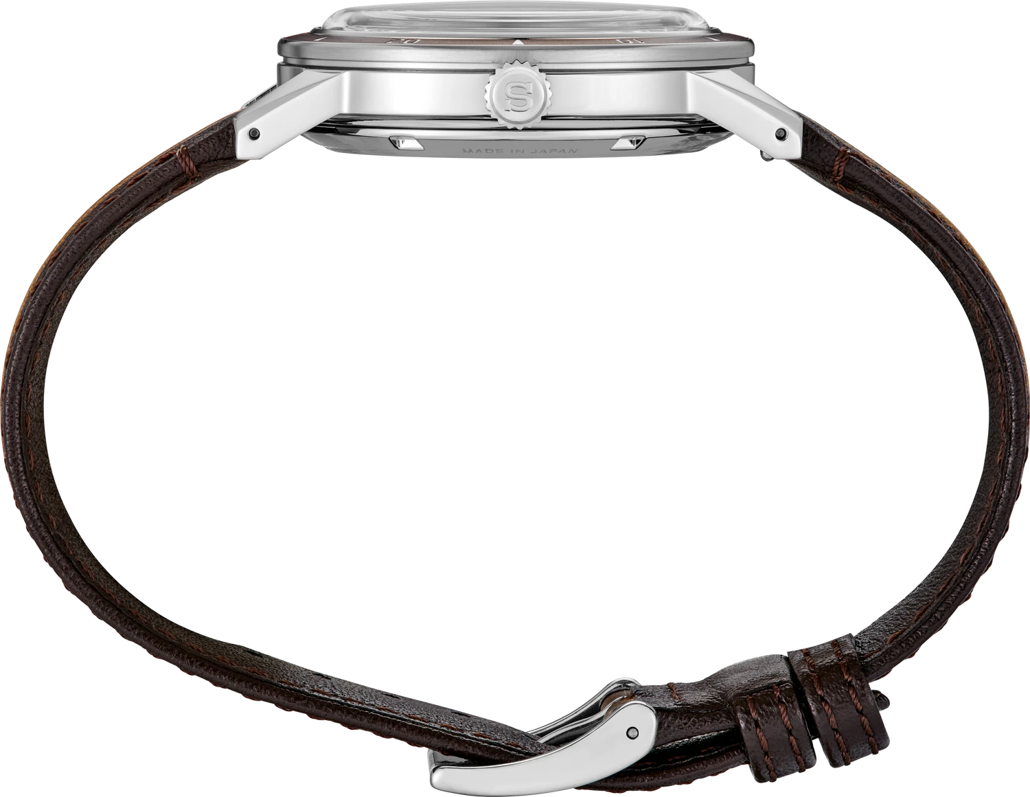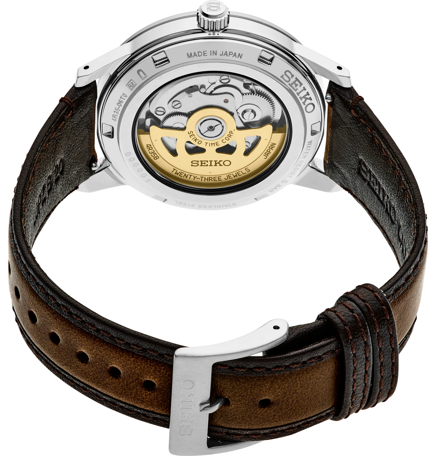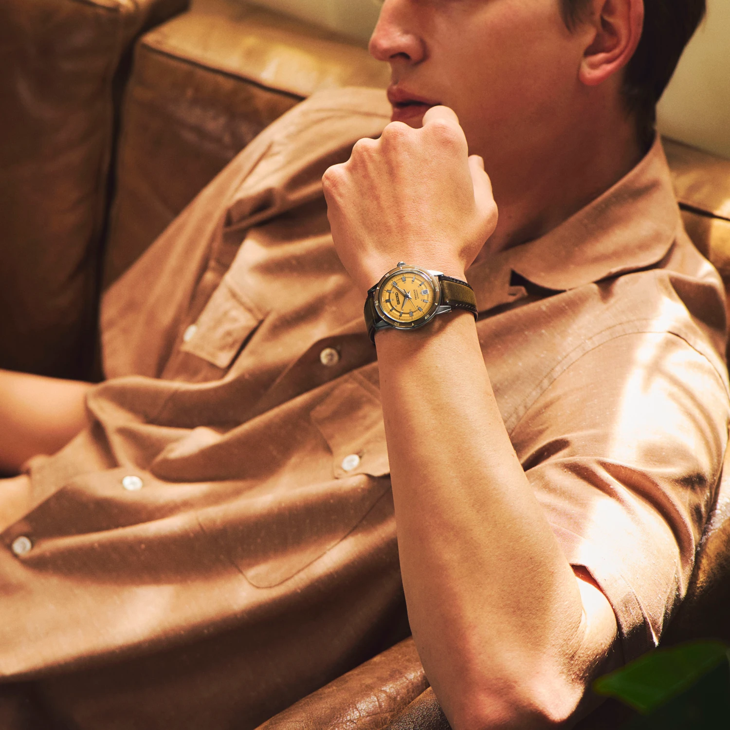 Presage Style60’s Collection. Celebrating the fresh spirit of the 1960s, this design is an homage to Seiko’s 1964 “Crown Chronograph,” combining a bold ruggedness with a refined and tailored style. Framed by a coordinating metallic bezel, the multi-layer dial inherits the layout of the original model with a futuristic flair and a golden yellow color inspired by mid-century aesthetics. The faceted indices are polished for an elegant shine, enhanced by the stainless steel case and box shaped crystal, providing beautiful dimensionality. Visible underneath the screwdown see-through caseback, the 23-jewel automatic movement beats at a frequency of 21,600 vibrations per hour and offers manual winding capability with a power reserve of approximately 41 hours. Crafted of stainless steel, this versatile timepiece is paired with a brown leather strap and includes a date calendar and LumiBrite hands and markers for superior visibility. 5 bar, 50M Water Resistant