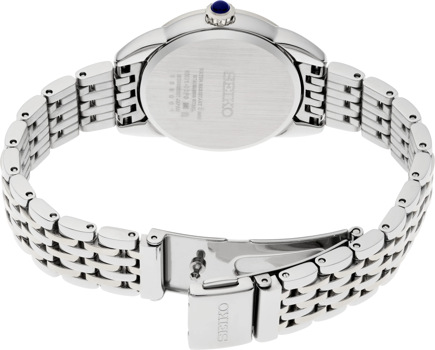 From the Essentials Collection. With elegant, jewelry-inspired styling, this gracefully updated watch features a sophisticated white dial with subtle center radial pattern, blue hands, and blue Arabic numerals for easy reading of the time at a glance. Including a classic cabochon crown, this beautifully balanced design is crafted of stainless steel and offers a tri-fold push button release clasp. 5 bar, 50M Water Resistant